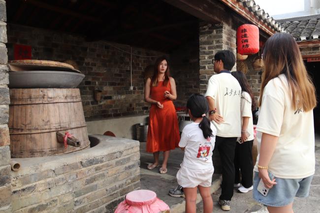 在辣椒坊,实践队员们被陈列在百格木架上的煳辣椒、糟辣椒、油辣椒所吸引。非遗传承人热情邀请队员们品尝坊内的各式辣椒,这些辣椒是工坊主人自己制作的,别具一番风味。通过访谈实践队了解到,这些辣椒采用传统的晒、腌、剁、封非遗工艺窖藏制作而成,已成功通过电商平台销往全国,生动展现了“舌尖非遗”的蓬勃活力。