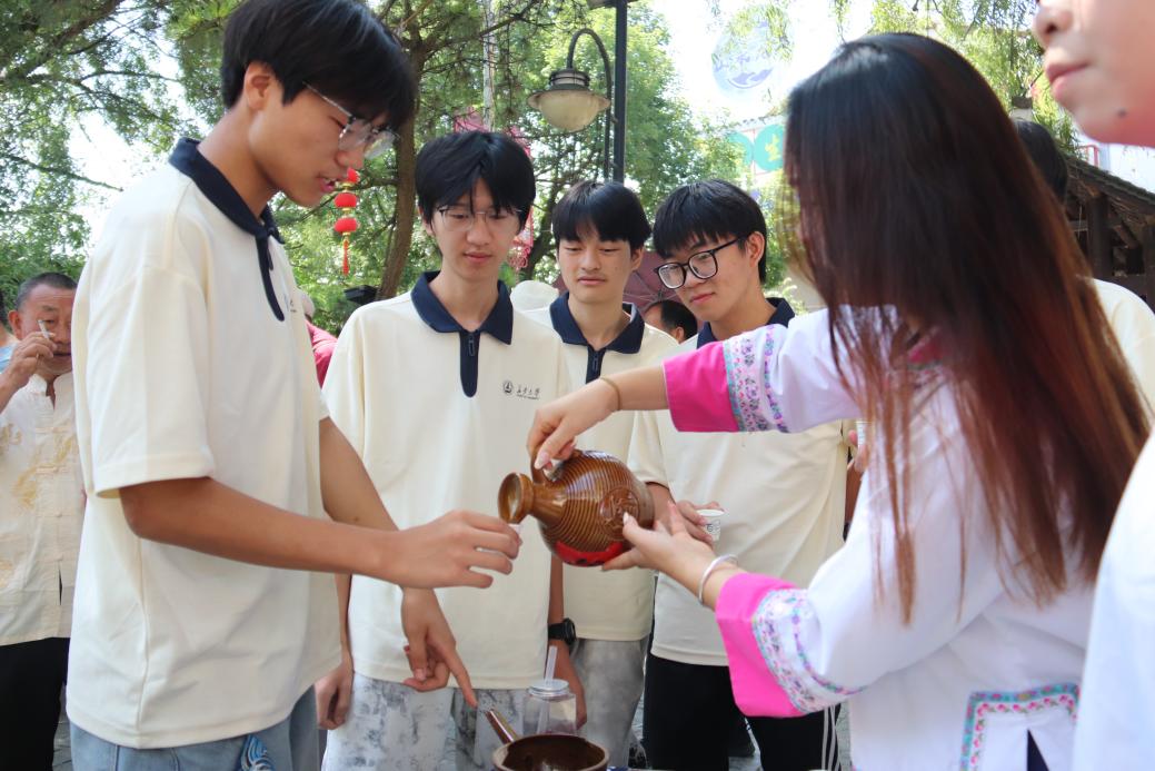 上午,实践队走至龙井村大门,恰逢布依族拦门酒仪式。拦门酒是布依族迎宾的最高礼节,蕴含着对宾客的诚挚欢迎与美好祝福。村民们身着民族服饰,手捧米酒,唱起悠扬的敬酒歌。队员们依循当地习俗,亲身体验了这一饱含民族深情的独特礼仪,深刻感受到布依族人民的热情好客与开放包容。