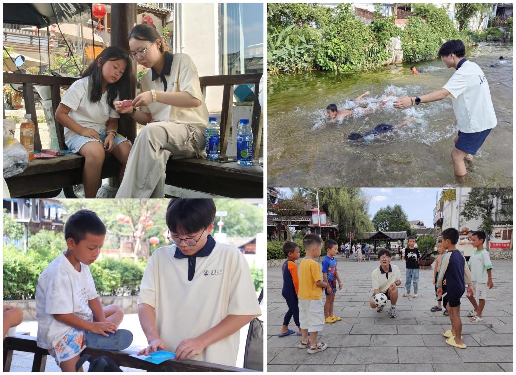 为促进村中各民族儿童相互了解,并创造运用普通话的实践环境,下午实践队将活动重心转向村里的孩子们,在村内组织了一场充满欢声笑语的文体活动。活动设置了游泳比赛、趣味足球和创意折纸等项目。游泳比赛中,孩子们在队员们的安全看护下尽情戏水;足球场上,奔跑追逐的身影和加油呐喊声交织成一片;折纸环节则激发了孩子们的创造力,他们用巧手折出各种有趣的造型。