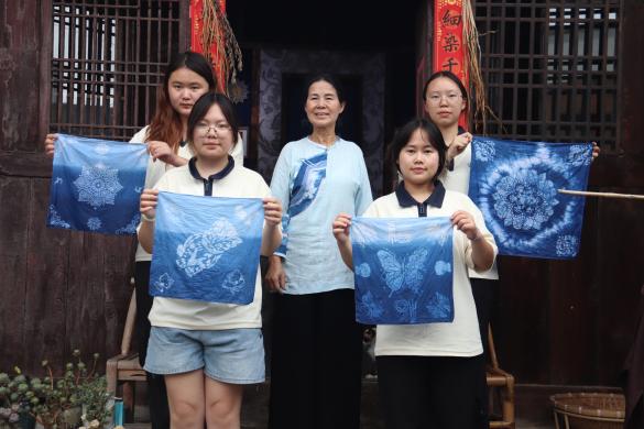 在非遗传承人张婷婷老师的带领下,实践队员体验布依族独特的豆染技艺,她细致示范基本工具使用方法以及制作工序。随后,队员们与张婷婷老师一起制作方巾,队员们在豆染的过程中深切体悟了传统非遗豆染的匠心独运,坚定了保护与发扬非遗传统文化的信念。