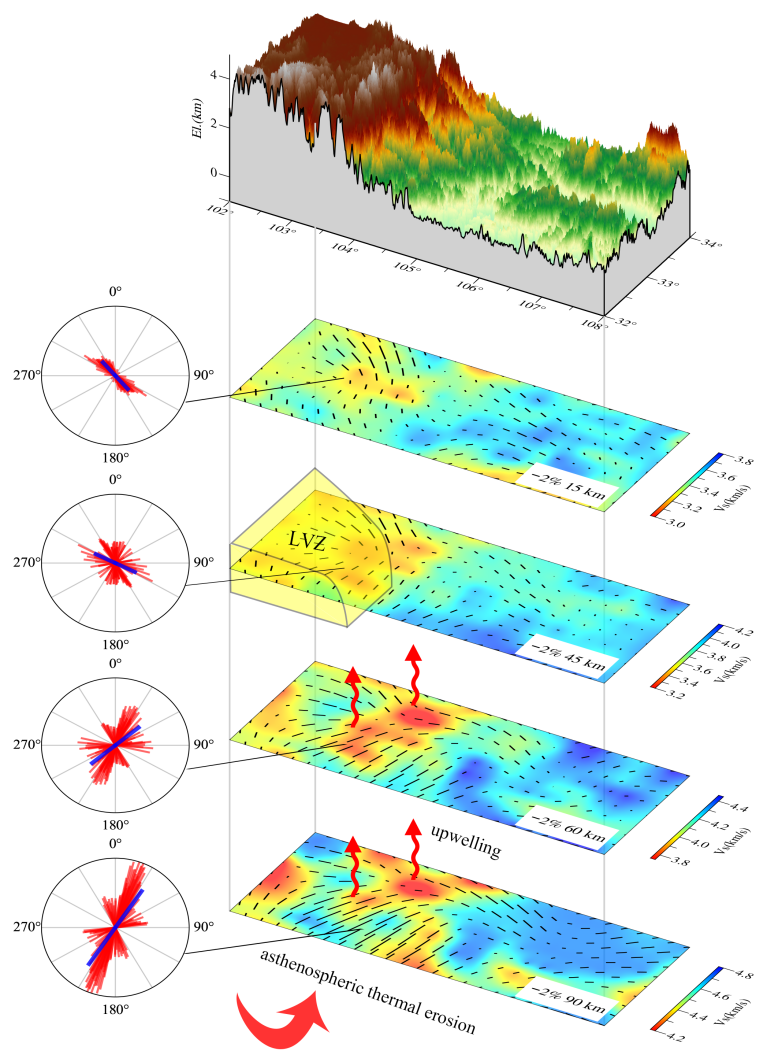 图3.松潘-甘孜东北部及邻区的地形、S波速度和方位各向异性结构的三维图。玫瑰图(左)显示了松潘-甘孜东北部的方位各向异性。红色箭头表示软流圈的活动。