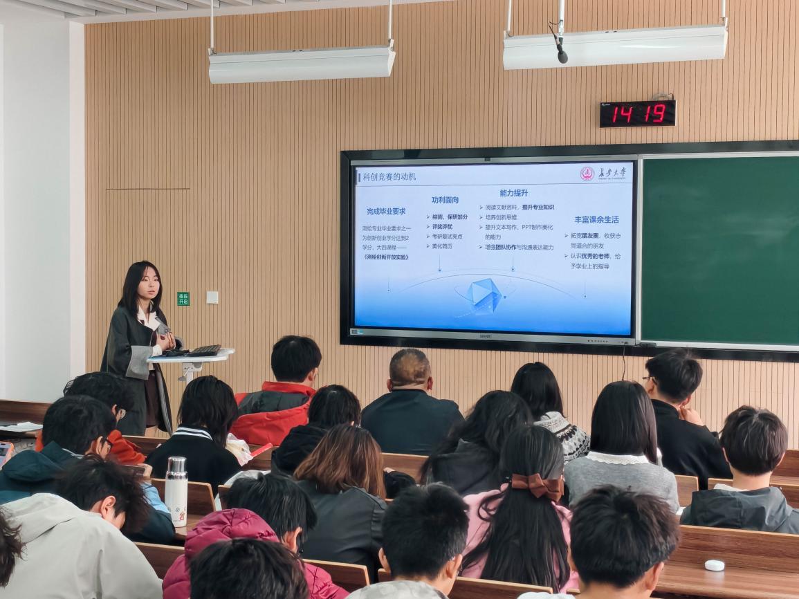 会议第二环节,由副主席梁怡晨发言。首先总结地测科协过去的工作成效并表达对未来发展的信心,其次详细介绍本学期工作安排及相关赛事时间,最后说明换届方式。发言中,他希望同学们保持科创热情,积累学科知识,积极参加竞赛,提高创新能力。