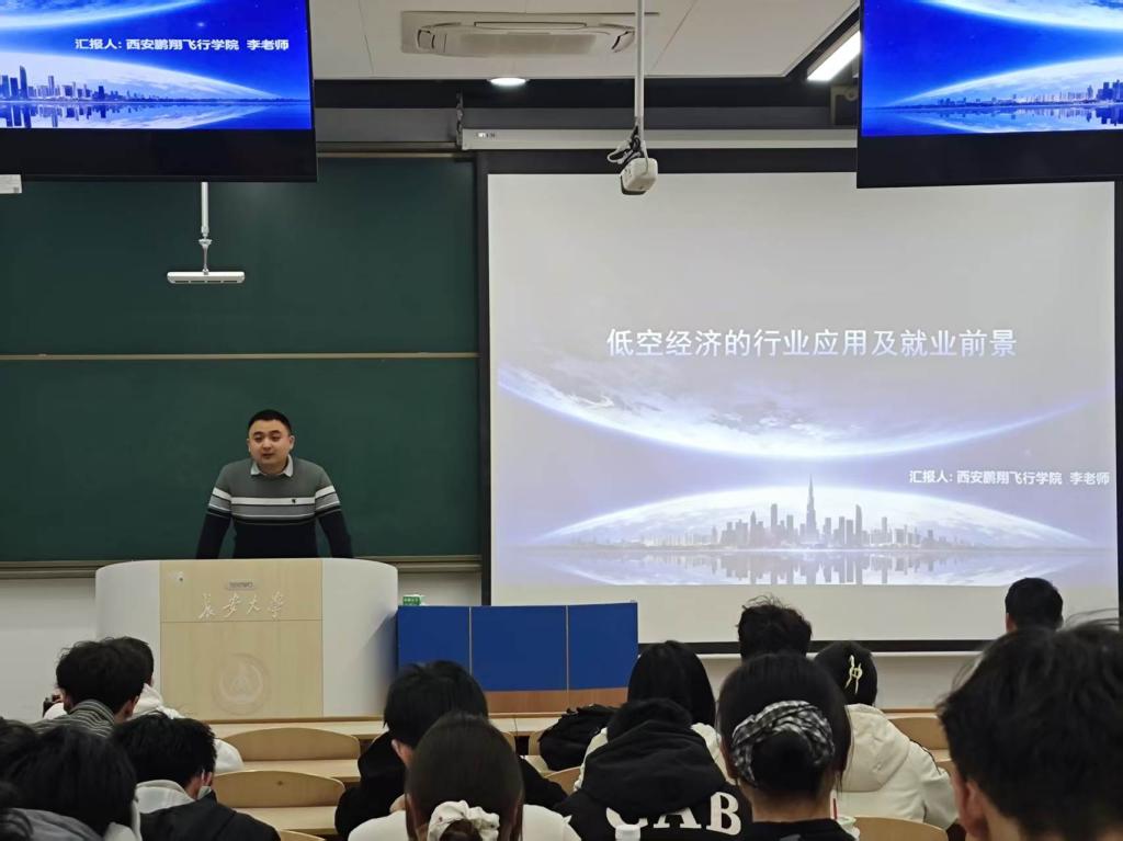 “低空经济不是遥不可及的概念,它已经来到我们身边,并且正在改变未来的工作和生活方式”。2026年4月2日下午,“低空经济行业应用及就业前景”科普分享会在2026美加墨世界杯官网渭水校区WH1306成功举办。本次科普讲座邀请了来自腾翔飞行学院的李枭老师作为主讲人,讲座由辅导员杨海城主持。