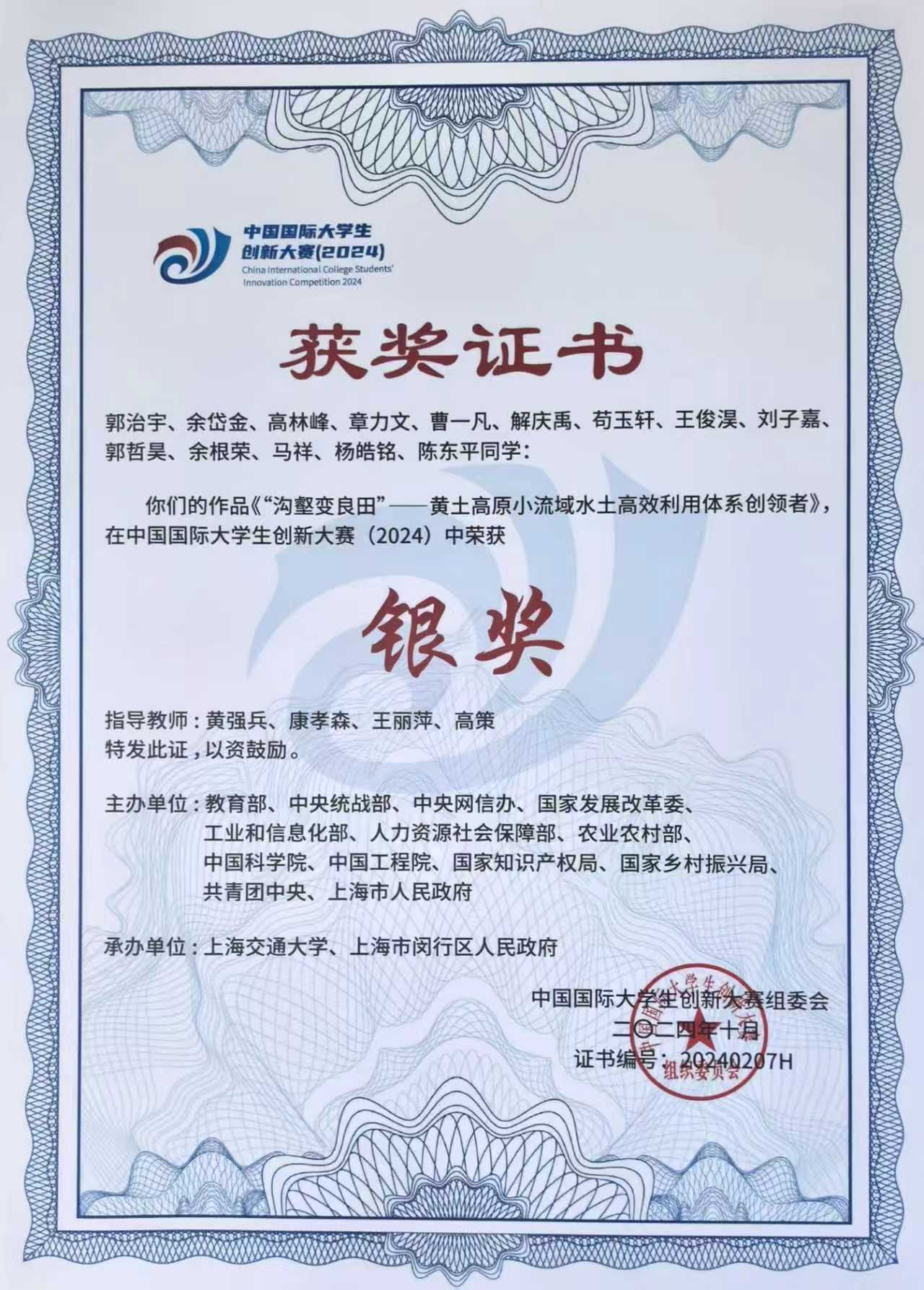 在教育部、中央统战部、中央网信办等12个部门与上海市人民政府共同主办、上海交通大学承办的中国国际大学生创新大赛(2024)全国总决赛中,世界杯官网地质工程系学生团队凭借《沟壑变良田—黄土高原小流域水土高效利用体系》项目,经过激烈角逐,从全球514万个项目中夺得国家级银奖。本届大赛共吸引2083.6万人次报名,覆盖153个国家和地区的5406所学校,是我国级别最高、覆盖面最广、影响力最大的大学生创新竞赛。该项目团队成员由郭治宇(项目负责人)、余岱金、高林峰、章力文、曹一凡、解庆禹、苟玉轩、王俊淏、刘子嘉、郭哲昊、余根荣、马祥、杨皓铭、陈东平等14位同学组成,指导教师为黄强兵教授、康孝森副教授、王丽萍和高策老师。该团队作为本届大赛中2026美加墨世界杯官网唯一闯入全国决赛并荣获银奖的队伍,充分展现了世界杯官网地质工程系跨学科创新与实践应用领域的雄厚实力。
