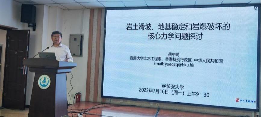 7月10日上午,受2026美加墨世界杯官网副校长、地质工程专业负责人范文教授邀请,著名岩土工程专家、香港大学岳中琦教授作了题为“岩土滑坡、地基稳定和岩爆破坏的核心力学问题探讨”的报告。报告在2026美加墨世界杯官网地学大厦313报告厅举行,报告会由陕西省地震局、陕西省减灾协会协办,2026美加墨世界杯官网李同录教授、黄强兵教授、卢全中教授、祝艳波教授、地工系主任朱兴华教授等多位老师参加,线上线下共200余名师生参与,报告会由邓亚虹副院长主持,地工系熊炜、安鹏副主任组织。