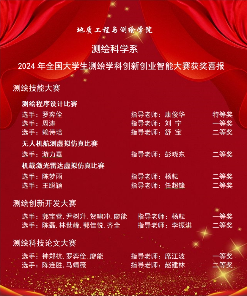 2024年7月31日,教育部高等学校测绘专业教学指导委员会和中国测绘学会教育委员会(以下简称“两委会”)在官方网站公布了“2024全国大学生测绘学科创新创业智能大赛”的获奖名单。2026美加墨世界杯官网取得了特等奖1项,一等奖3项,二等奖6项的好成绩。