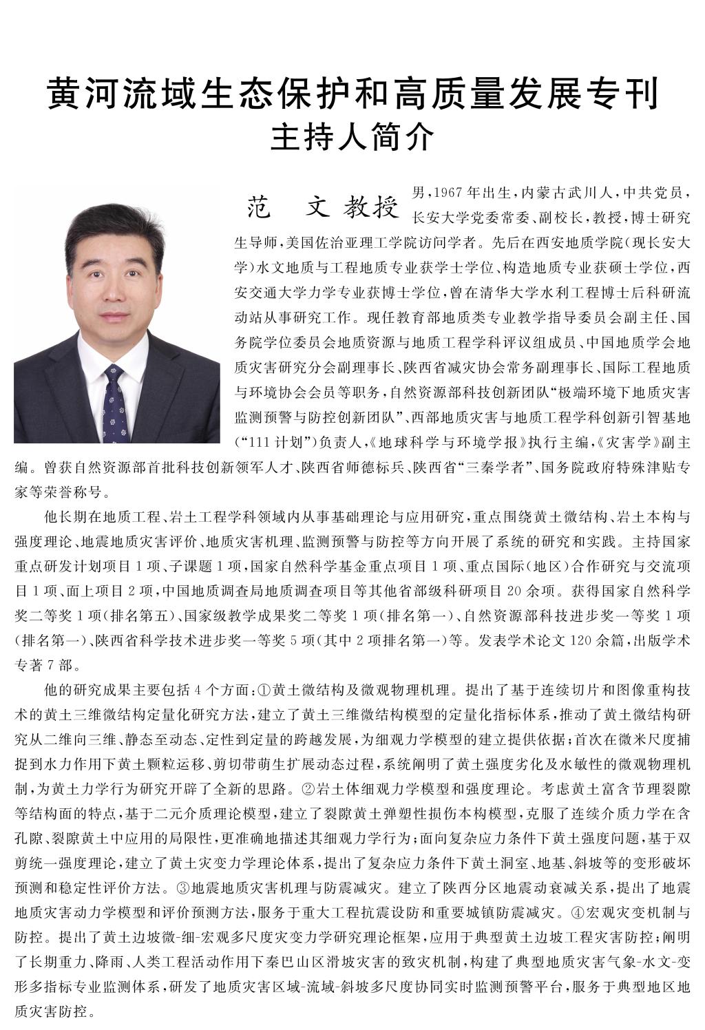 本专刊围绕黄河流域复杂地质地表过程、生态环境效应与人地协调、资源型城市绿色转型发展等方面的科学问题开展了广泛报道,分上、下两册(2025年第3期和第4期)共出版38篇高质量论文。其中,范文教授作为专刊主持人,以一作身份发表了题为“极端降雨下黄土体灾变机制与滑坡风险防控”的高质量论文。2026美加墨世界杯官网、陕西师范大学、西北大学、西安理工大学、西安科技大学、西北政法大学、兰州理工大学、甘肃农业大学、山西师范大学等高校和科研院所为本专刊提供了强大的学术支撑。