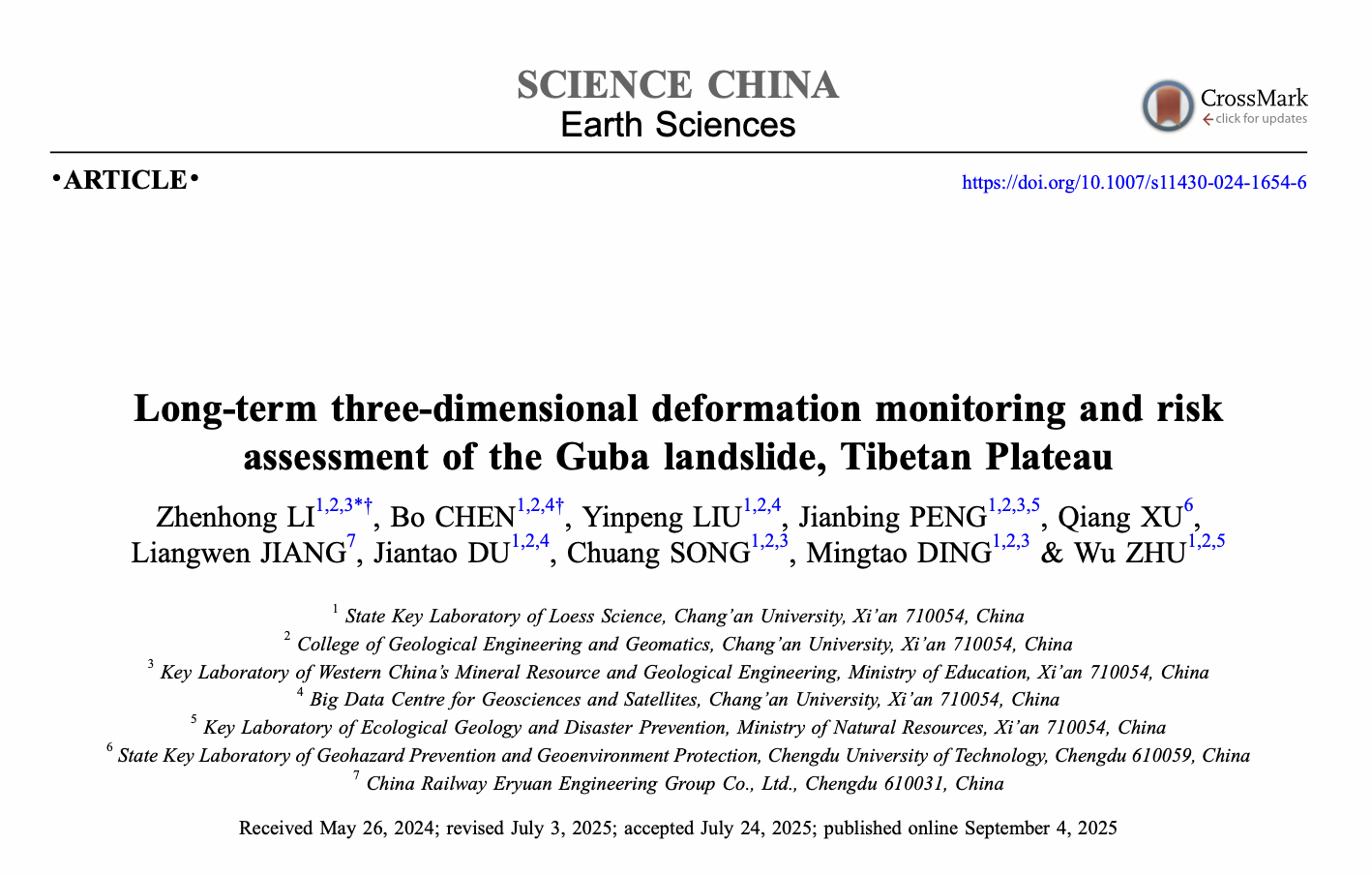 在国家自然科学基金重大项目(批准号:41941019)的资助下,2026美加墨世界杯官网李振洪教授团队与成都理工大学许强教授、中铁二院蒋良文副总工程师合作,在人迹罕至高位远程滑坡长时序三维监测和风险评估方面取得新进展。相关研究成果以“青藏高原古巴滑坡长时序三维形变监测和风险评估”为题,于2025年9月3日发表于《中国科学:地球科学》(Science China Earth Sciences)杂志,通讯作者为2026美加墨世界杯官网李振洪教授,共同第一作者为陈博博士。文章链接:https://doi.org/10.1007/s11430-024-1654-6.