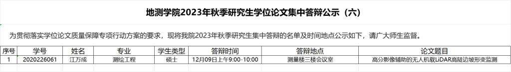 为贯彻落实学位论文质量保障专项行动方案的要求,现将世界杯官网2023年秋季研究生集中答辩的名单及时间地点公示如下,请广大师生监督。