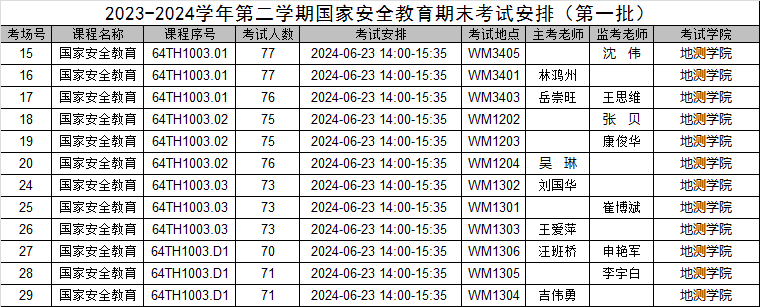 本学期国家安全教育期末考试监考安排已发布,监考教师可同时在本科教务系统中查看监考安排。为确保考试平稳顺利进行,学院已将相关监考工作安排表格上传到附件中,请各位老师及时下载查阅,并按时完成监考工作。