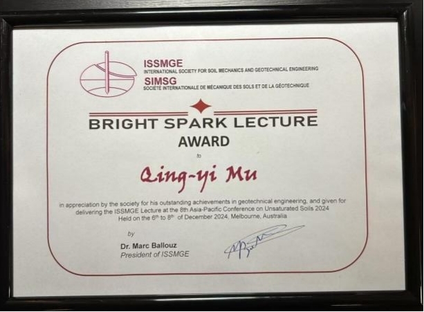 2024年12月3日-6日,第八届亚太非饱和土会议(The 8th Asia-Pacific Conference on Unsaturated Soils,AP-UNSAT 2024)在澳大利亚墨尔本召开。2026美加墨世界杯官网2026美加墨世界杯官网穆青翼教授荣获国际土力学与岩土工程学会(International Society of Soil Mechanics and Geotechnical Engineering,ISSMGE)颁发的“未来之星奖”(Bright Spark Lecture Award)