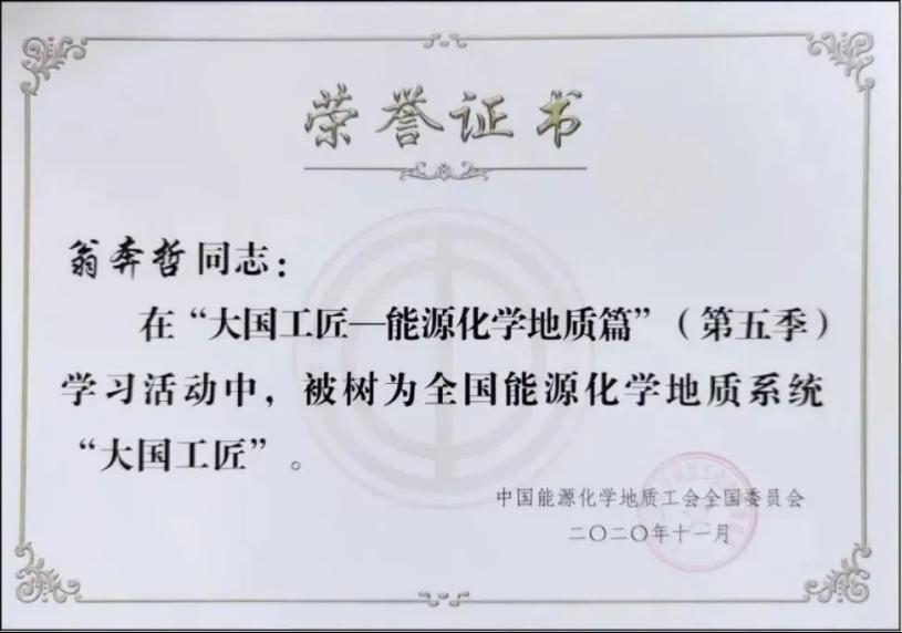 2020年被中国能源化学地质工会全国委员会评为“大国工匠”。