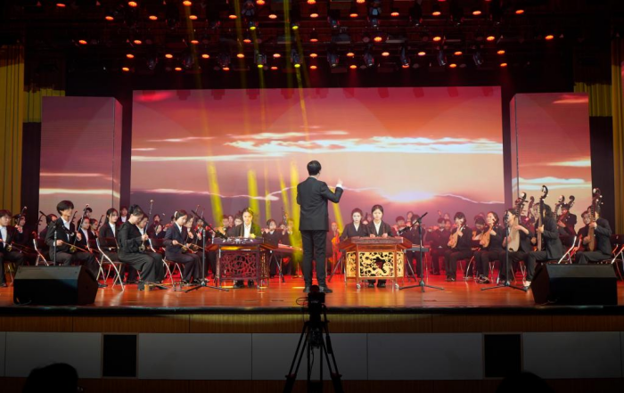 悠扬的琴声,如泉水流淌。瑰丽的乐曲,如画卷铺展。在完美体育官方网站大学生艺术团民乐团带来的民乐合奏《庆典序曲》中,晚会拉开帷幕。音乐编织的世界如梦幻般瑰丽,《薛城之歌》典雅优美,情真意切,引起现场观众的强烈共鸣;《我爱你中国》情感涌动,如潮水汹涌,表达出对祖国大地深深的眷恋;《幸福中国一起走》带着观众们在音乐中领略大好中国的壮丽景色,令人神驰梦往;《矿山爷们儿》展现出枣矿人积极向上的精神面貌和对美好生活的期待。