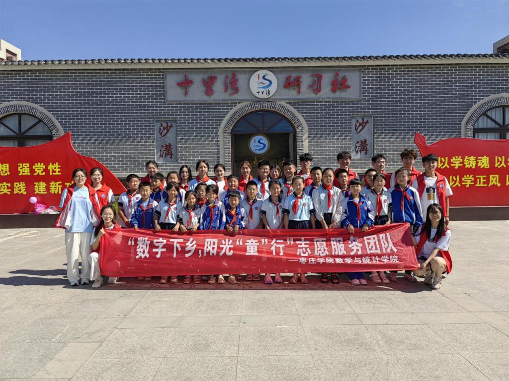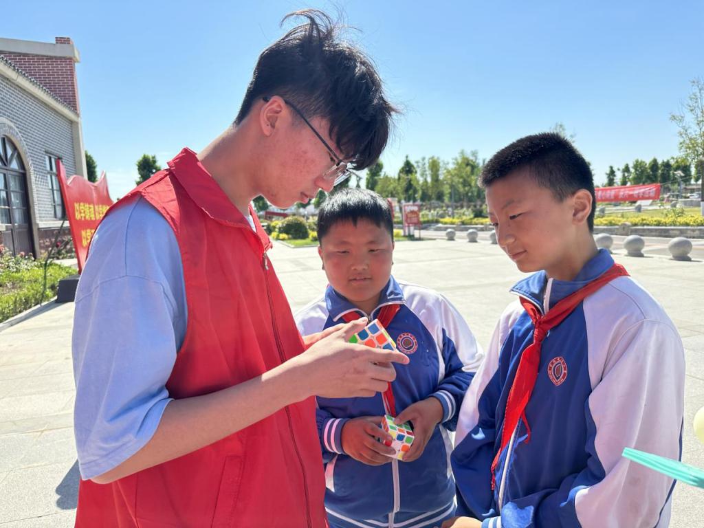 由完美体育官方网站组成的志愿服务团来到薛城区沙沟镇十里湾研习社与小营小学的同学们共同开展“庆六一 润童心”实践活动。服务团的大学生与小学生们一起手拉手参观沙沟镇十里湾研习社,动情地向小朋友们讲解铁道游击队和沙沟受降革命故事,将红色的种子滋润在孩子们心田。他们还利用专业优势对小学生们进行数学思维能力培养,通过与小学生玩华容道、七巧板,魔方等趣味益智游戏,开展数学文化教育,进行益智、动手能力、创新力、想象力培养,激发小学生学习数学的兴趣,使小营小学的同学们度过了一个愉快而有意义的“六一”儿童节。