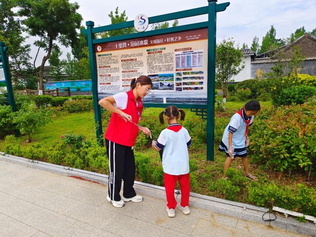 活动中,大学生环保志愿者服务团队走进薛城区沙沟镇十里湾研习社,结合“世界环境日”开展环保知识宣传及实践活动,大学生带领小学生一起参观了十里湾生态环境公园,向小学生宣传保护环境、建设生态文明的重要意义,教给小学生怎样进行垃圾分类,增强小学生的保护环境的意识。大学生志愿者和小学生们一起清理社区垃圾,并将小学生捡到的可回收垃圾兑换成学习用具,激发孩子们保护环境的热情和积极性。