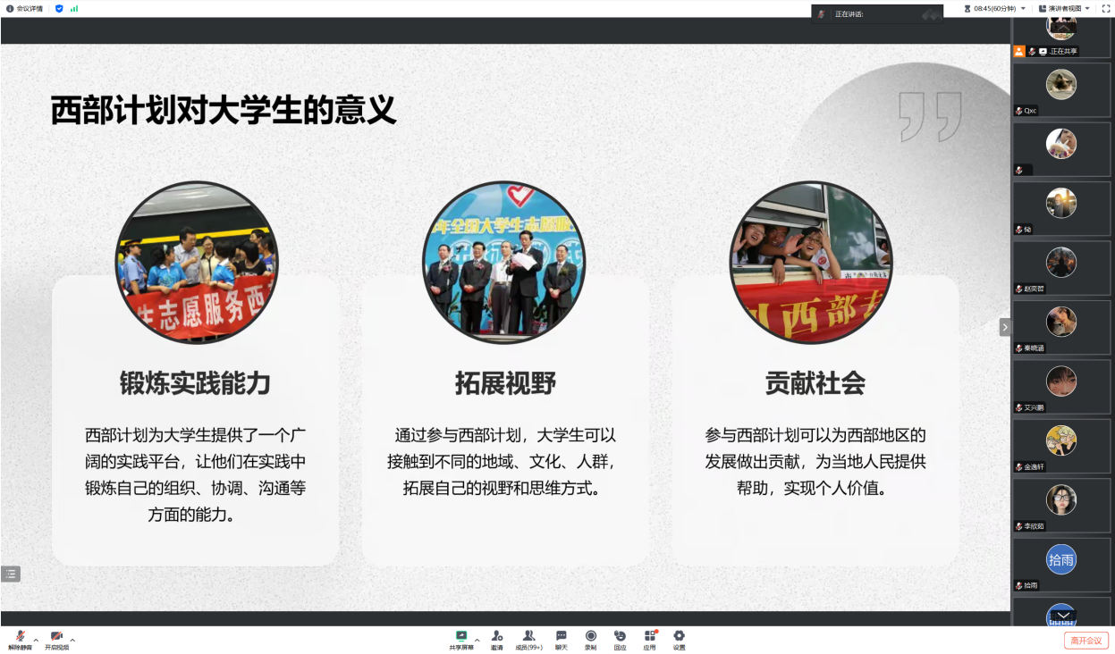 2024年5月8日,完美体育官方网站召开西部计划线上宣讲会,邀请2023届毕业生刘朝阳师兄师弟们介绍西部计划相关情况。
