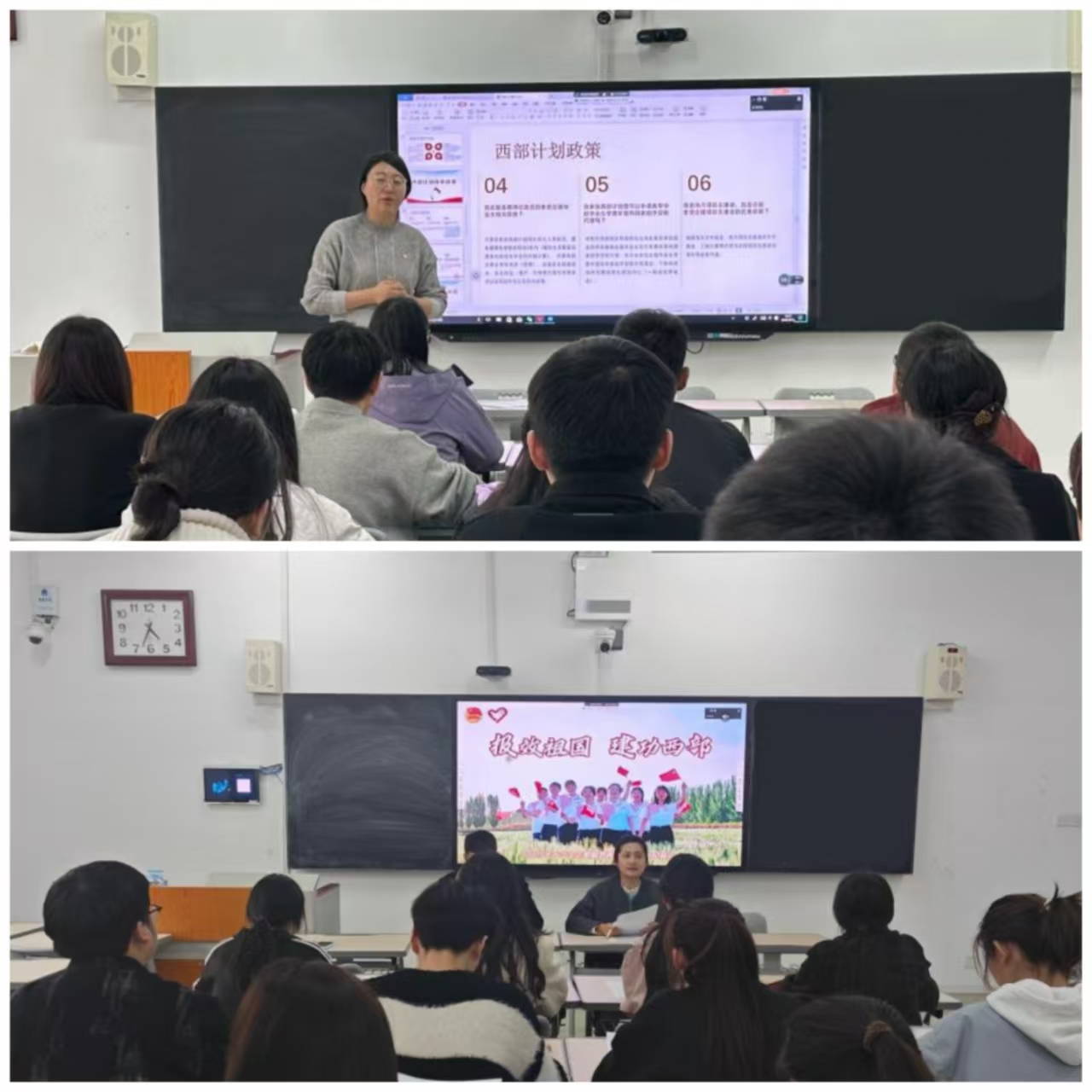 韩晓瑞从国家和个人角度向毕业生宣讲了参加西部计划的意义,介绍了西部计划的相关政策,鼓励同学们扎根西部。毕业班辅导员王晓明也开展了“报效祖国,建功西部”的宣讲,现场气氛热烈。