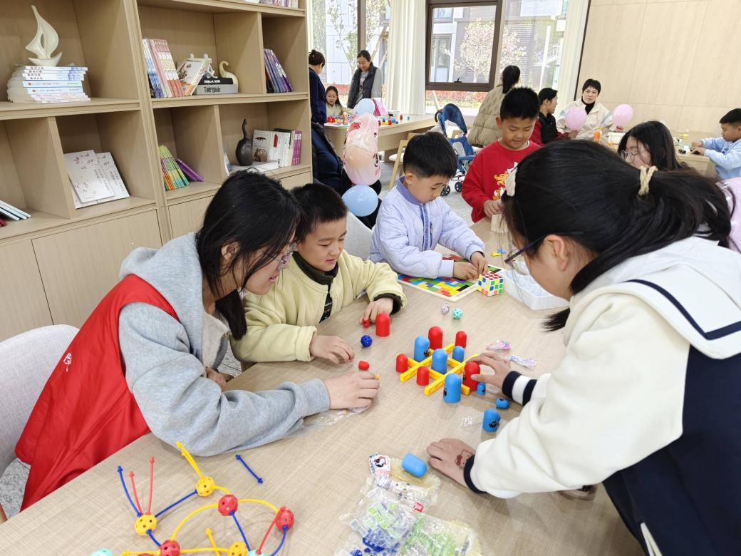 活动中,志愿者们为社区中的小学生开展数学课兴趣培养工作,他们通过PPT讲解数学的趣味知识与实际应用,并带领孩子们体验魔方、华容道、七巧板等益智游戏,以寓教于乐的方式展现数学魅力,在互动中培养数学思维,激发学习兴趣。