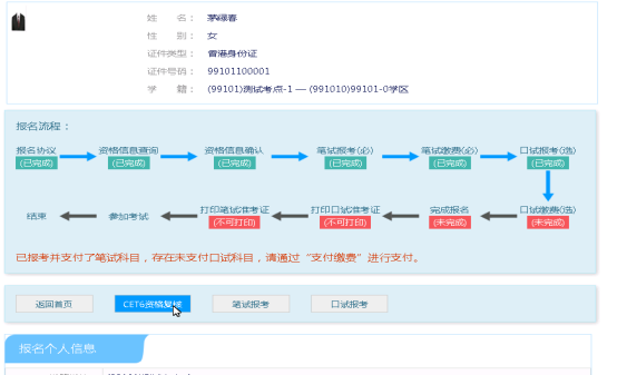 考生可以在这个页面,检查自己的照片和基本信息是否正确,查看自己的报考资格科目和进行CET6资格复核申请。