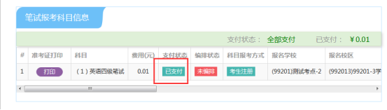 5.缴费时,如银行扣费成功,但系统显示科目支付状态为“未支付”时,不要重复缴费,可点击“更新”按钮更新支付状态,或拨打考点咨询电话查询支付状态。因考务问题或技术问题造成重复缴费需要退费的,教育部考试中心会在考试结束一个月内原路退回考生账户。