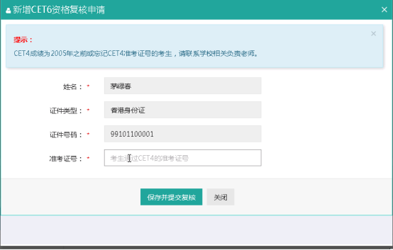 填写考生的四级准考证号,如果准考证号正确,那么姓名和证件号码任意一项正确就可以自动审核通过。