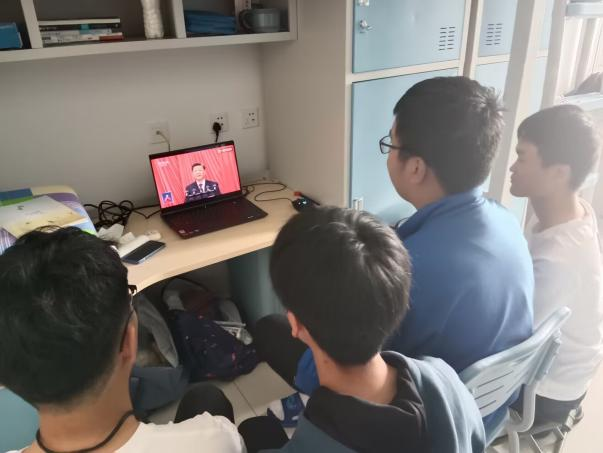 同学们在宿舍三五个人组成小组,在收看直播的同时积极探讨。
