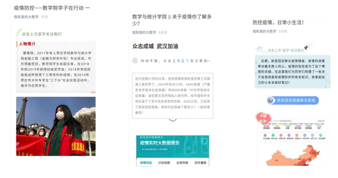 另外,公众号还大力宣传报道数学学院大学生疫情期间热心参与防疫志愿者的情况。