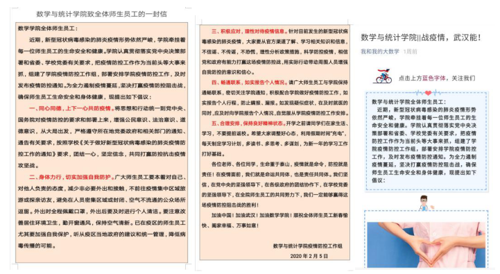 四、真情关心关爱,切实排忧解难。学院疫情防控工作组通过“五个一”服务模式,即为师生开通一条抗“疫”热线、提供一个网络平台、送上一份暖心问候、准备一份心理处方、发出一个互助倡议,主动关注被隔离师生,为他们提供精准心理支持;发挥班级心理委员的作用,引导同学们积极调整心理状态,正确看待疫情,安心生活学习。各班辅导员、班主任认真做好本班学生的心理疏导,坚定学生信心。充分运用新媒体阵地和网络资源开展学生活动,实现教育全覆盖,保障党员思想引领和教育活动有序推进,通过学院微信公众号发布《抗击疫情,我们在行动》、《关于疫情你了解多少》、《防控疫情,日常小生活》、《疫情防控——数学院学子在行动》等系列防疫内容