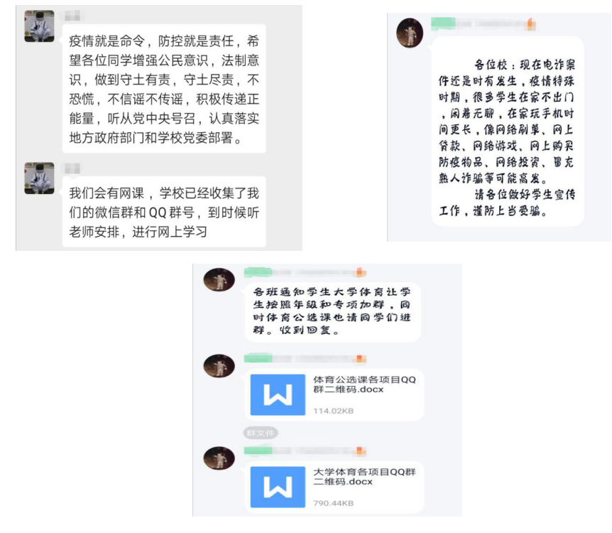 二、聚焦立德树人,抓好教育引导。党员和辅导员和班主任第一时间在班级群转发官方信息,再三嘱咐同学们认真关注、高度重视,同时提醒广大师生务必观看关注官方渠道的信息报道,正确认识新型冠状病毒的影响,避免引起恐慌,鼓励大家传递正能量。为充分发挥党员和学生干部的模范带头作用,采取“包产到户、责任分工”制,让每个党员承包1个班级,让每个班委固定对接本班几名同学,深入了解每个对接学生的信息和动态,确保能够在需要时第一时间联系到每一位同学。面对大一到大三的学生,引导学生“停课不停学”在家制定学习计划,各班成立学习小组相互督促,不断充实和提升自我。面对大四的毕业生,积极在网上答疑解惑,开展就业指导、考研复试指导、线上求职辅导,及时发布各类就业信息和网上招聘信息。