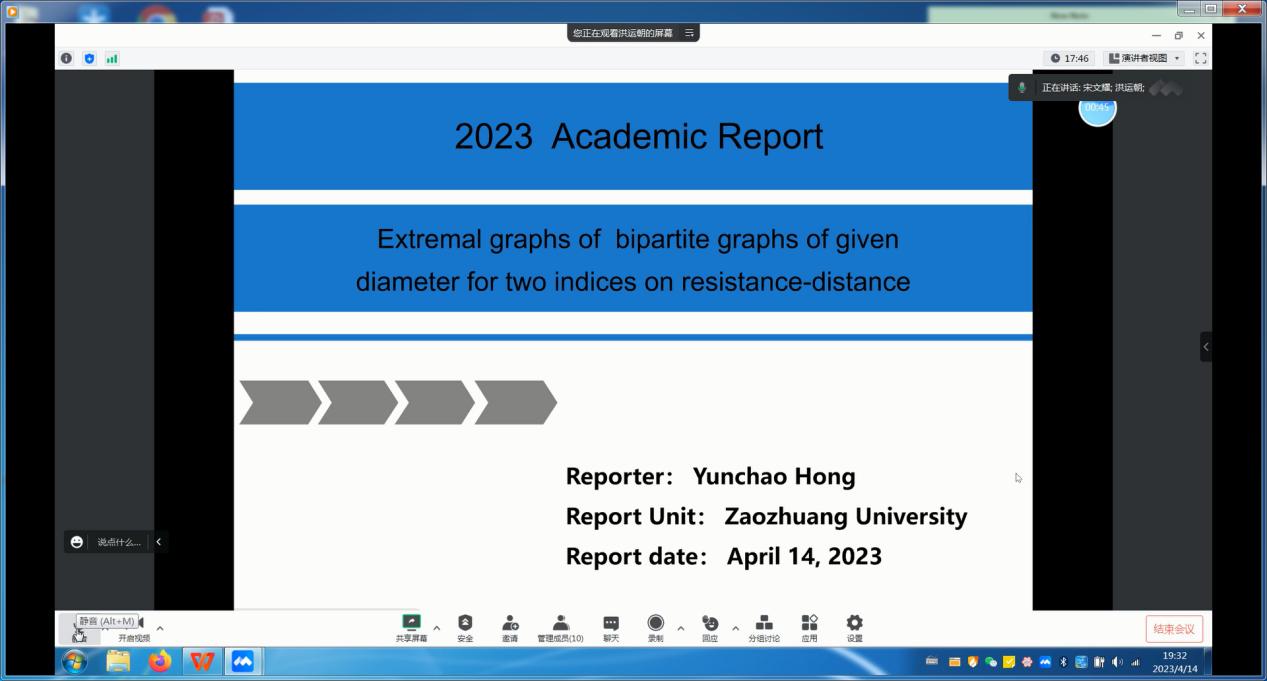 4月14日下午,中国矿业大学数学学院洪运朝博士应邀为完美体育官网教师作主题为“Extremal graphs of bipartite graphs of given diameter for two indices on resistance-distance”的学术报告。完美体育官方网站运筹学与控制论科研团队教师参加会议,科研秘书宋文耀老师主持报告会。
