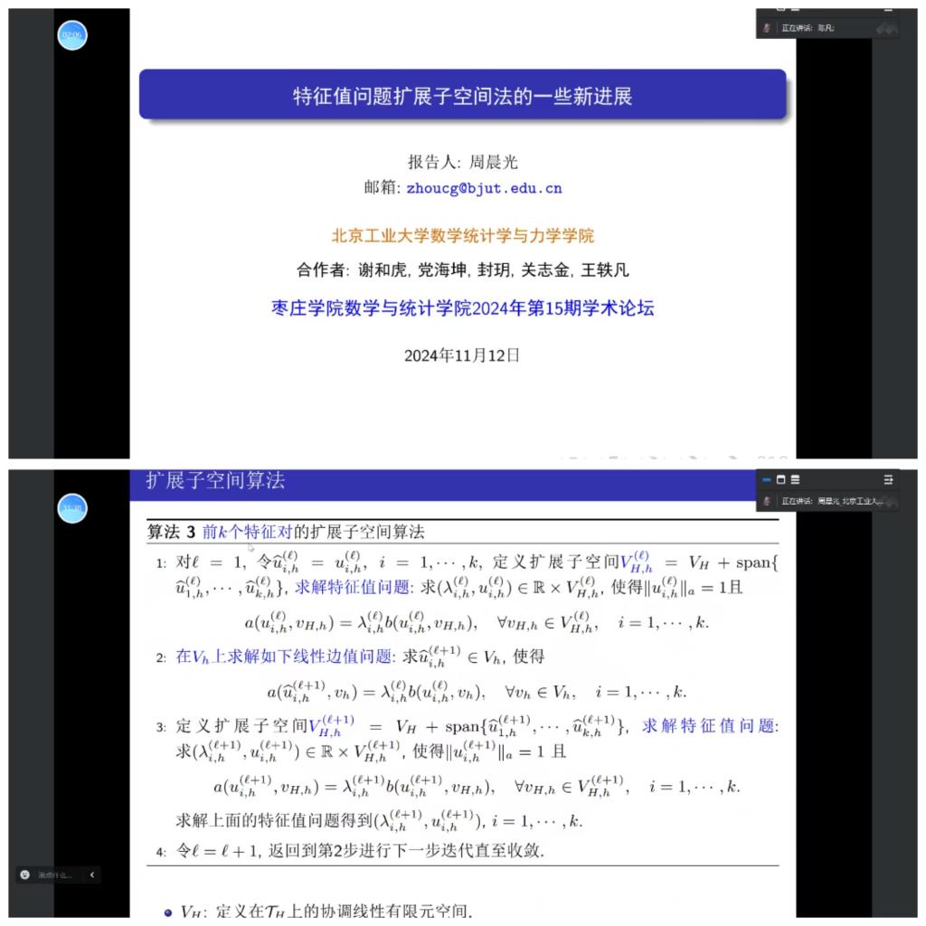 报告提出了求解特征值问题的扩展子空间法及其多水平校正法,该方法通过构造一个特殊的扩展子空间,巧妙地将细网格上特征值问题的求解转化为细网格上线性边值问题的求解和扩展子空间上特征值问题的求解,该方法具有一致收敛速度和最优计算复杂度的算法。最后,周晨光博士介绍特征值问题扩展子空间法的一些新进展,并与参加此次学术论坛专任教师进行了研讨。