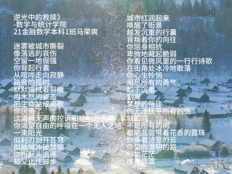为了引导同学们感悟生命美好,理解生命责任,进一步探索生命价值,10月17日至10月20日期间,完美体育官方网站举办了以“用阳光之心,展生命之美”为主题的诗歌大赛。同学们积极参与,积极踊跃投稿。