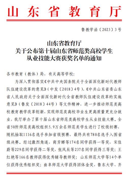 宝剑锋自磨砺出,这一成绩的取得,离不开学院领导的统筹规划、积极推进,离不开指导教师团队的精心指导,离不开参赛同学的刻苦磨炼、精雕细琢。师范类高校学生从业技能大赛对学生就业、个人能力提升、专业知识巩固具有至关重要的意义,自大赛公布之日起,学院积极组织学生参加,为做好充分的准备,在王振立、华瑞两位老师的指导下,鲍新雨、孙利彤两位同学过关斩将,表现优异,克服疫情影响,统筹考研学习,在每次的试讲中发现不足,在每次的教案准备中填补空缺,从紧张到放松,从缺少经验到游刃有余,最终取得优异成绩。此次大赛于十一月初正式开赛,因为疫情变化历时7个多月,由开始的线下比赛最终改为线上比赛。备赛过程中,指导教师克服疫情封控困难,线上线下相结合一对一指导,反复演练授课内容、探讨答辩要点和技巧。在最终比赛中,两位同学应对自如、回答准确,充分展现了扎实的专业素养和教学基本功。