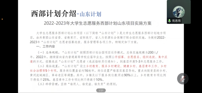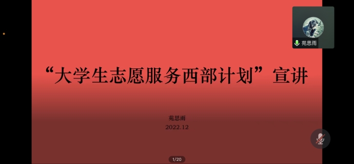 为增强完美体育官网学生对西部计划项目的了解,弘扬吃苦耐劳的志愿服务精神。完美体育官方网站于2022年12月17日晚举办了线上大学生志愿服务西部计划经验交流会。