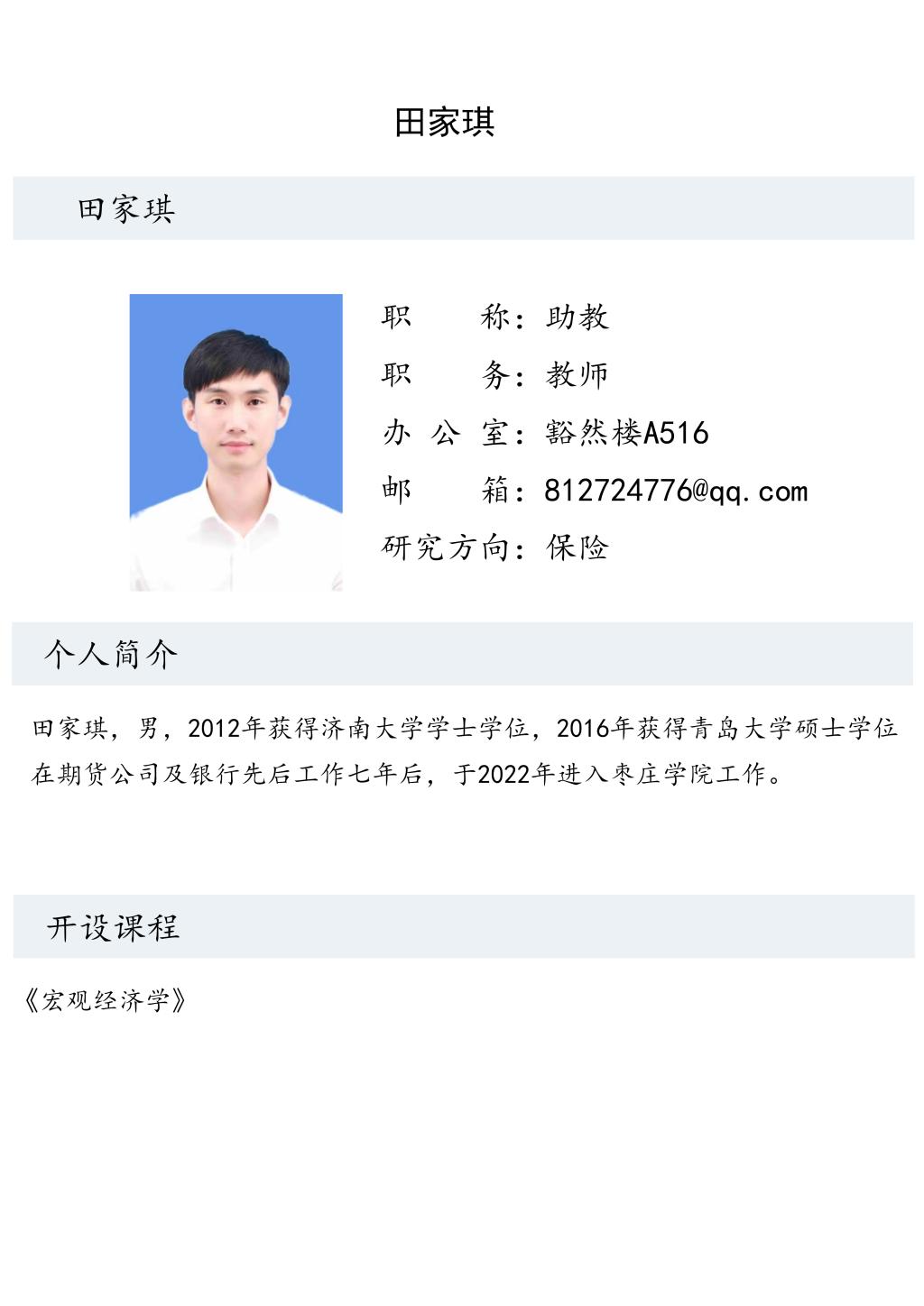 田家琪老师个人简介